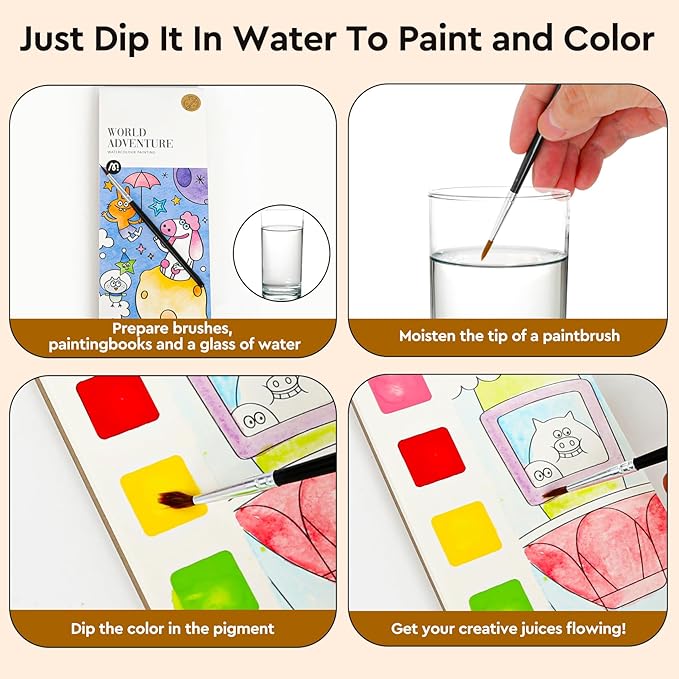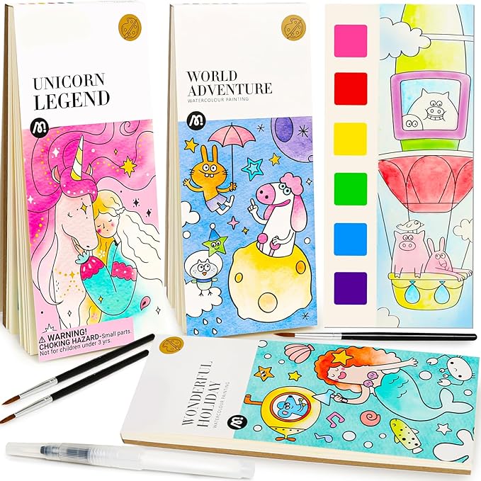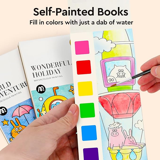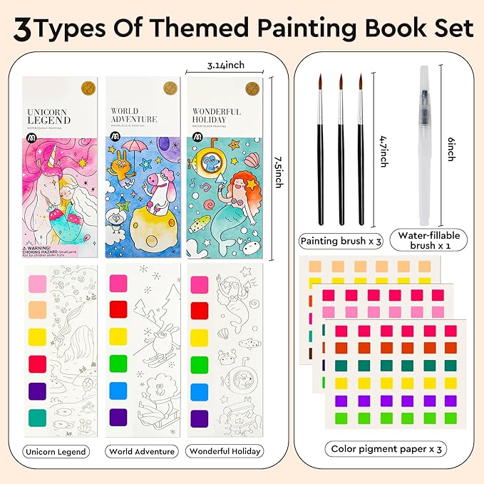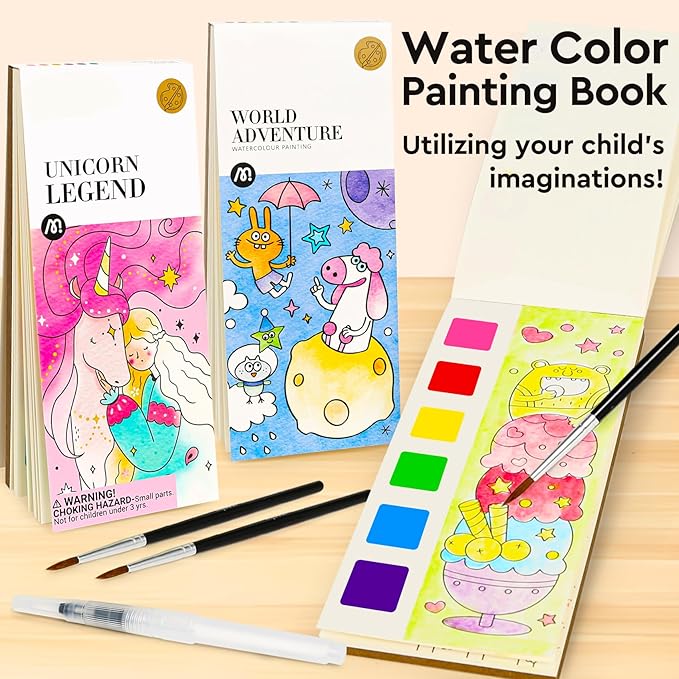 - Watercolor Book:This watercolor book for kids comes with everything needed to start painting right away,including brushes and paints.Just wet the brushes and moisten the paint palette,this watercolor painting bool kit perfect for kids ages 3-4,5-6,7-9,the thoughtful design ensures a clean and enjoyable painting experience.