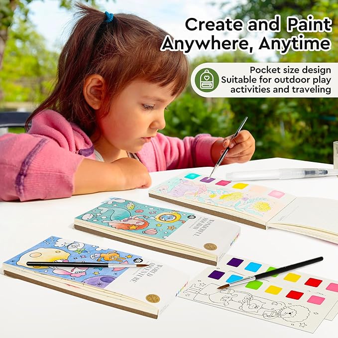 - Water Color Paint Sets for Kids:This small, pocket-sized watercolor book is perfect for on-the-go creativity. It can easily be turned into a travel art set, allowing kids to paint wherever they are. Once a page is finished, it can be torn off along the dotted line and turned into a colorful bookmark or art craft. This feature makes it a great stress reliever and fun activity for toddlers, kids, or even adults.