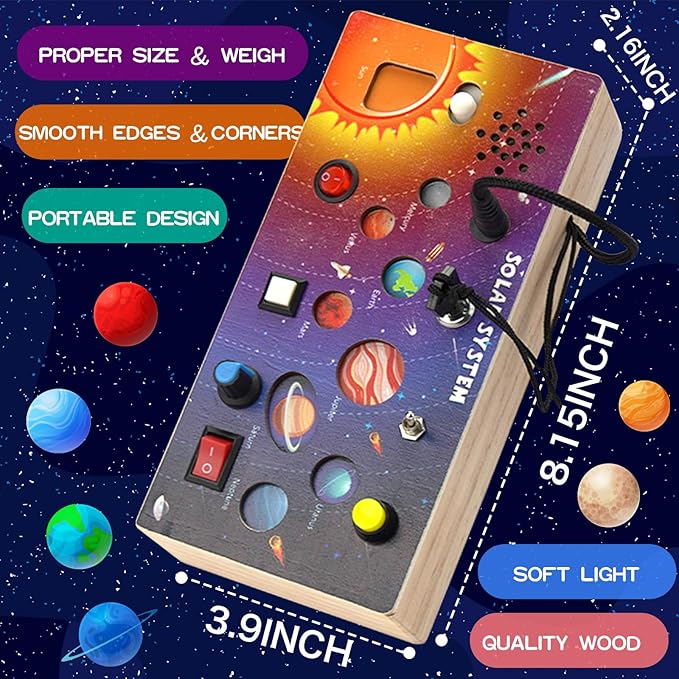- Learning Experience: This busy board has a vivid solar system pattern and carefully designed LED lights, which attracts children's curiosity and helps children learn about the solar system. This enlightenment toy allows your child to concentrate and provide tactile and visual experiences, which can help children enjoy the fun of learning to operate switches
