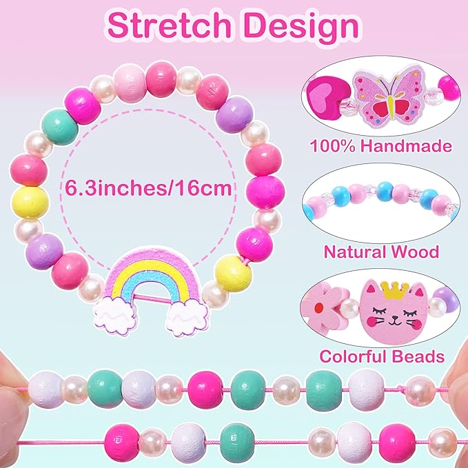 - Natural Handmade Bracelets: Crafted from natural wooden beads and charms with non-toxic paint, our bracelets are safe and durable. Their lightweight and rounded design make them comfortable for kids to wear daily, while the bright colors and adorable patterns add sweetness to any outfit.