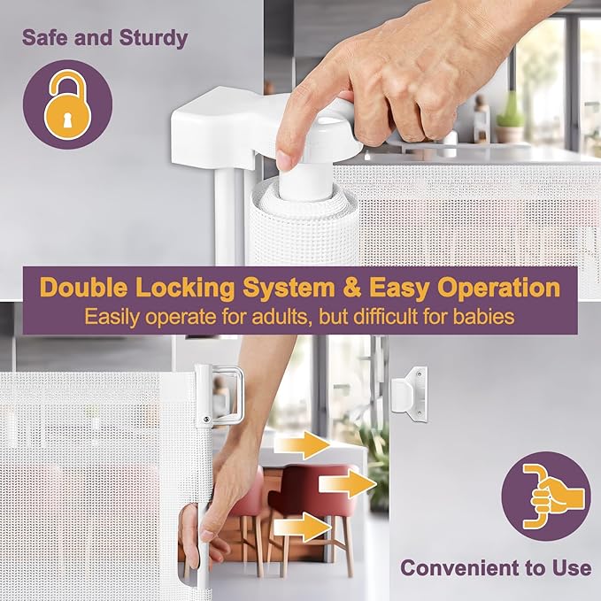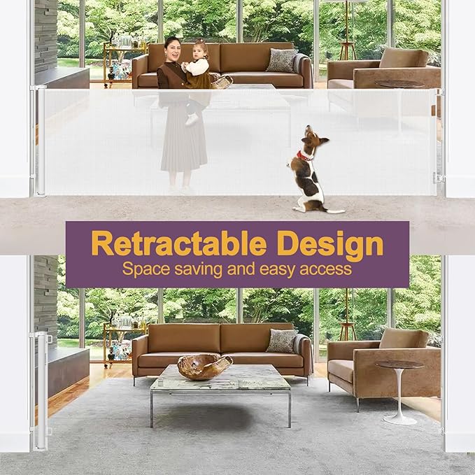 - 160 Inch Extra Wide & Retractable Design: Our extra tall pet gate fits 0-160" wide openings. You can adjust the width to fit your wide opening according to your needs. When not in use, the mesh can be completely retracted away to save you space.
