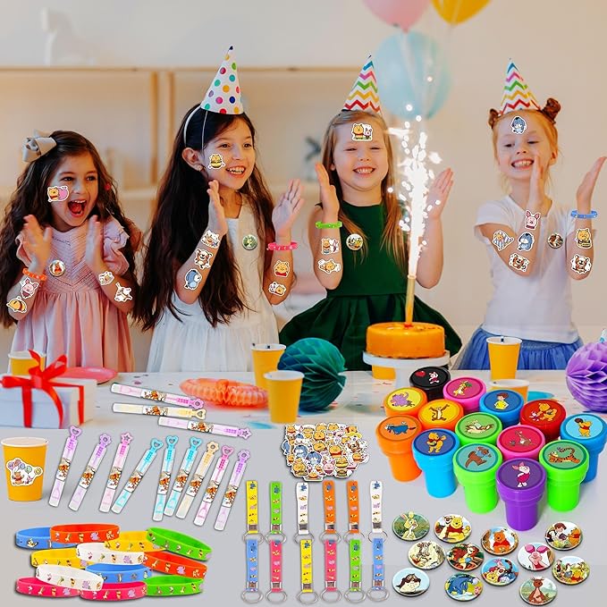 - Themed Stampers, bracelets, pins, and keychains: This party supply package includes many funny themed gifts that can be filled with small items like candy, chocolates, as well as keychains, Stampers, pins, and bracelets to turn the gift pack into a surprise box that kids will love to open.
