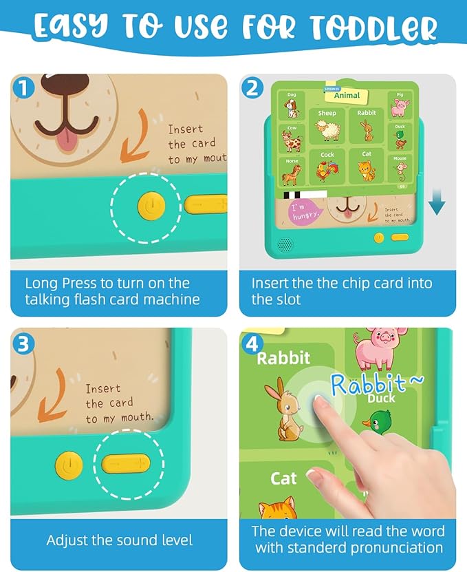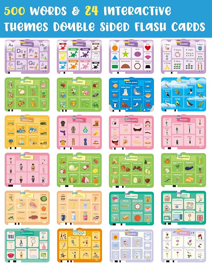 - Interactive Learning: This talking flash card sound book reader comes with 23 themes double-sided 500 words cards covering colors, animals, and fruits,etc. This device not only boosts fundamental cognitive skills but also enhances memory through engaging interactions, making it a great tool for comprehensive child development