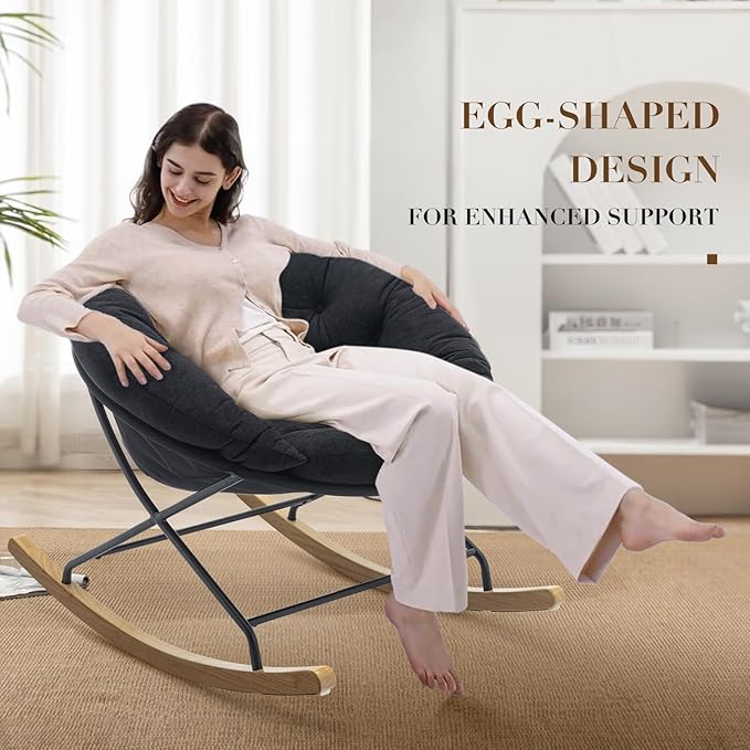 - 🍀 Egg Shaped Rocker with Superior Comfort: Our upholstered Papasan saucer rocking chair features a thick, plush, padded cushion that cradles you in comfort. The cushion's soft, tufted design ensures a cozy and relaxing experience every time you sit down.