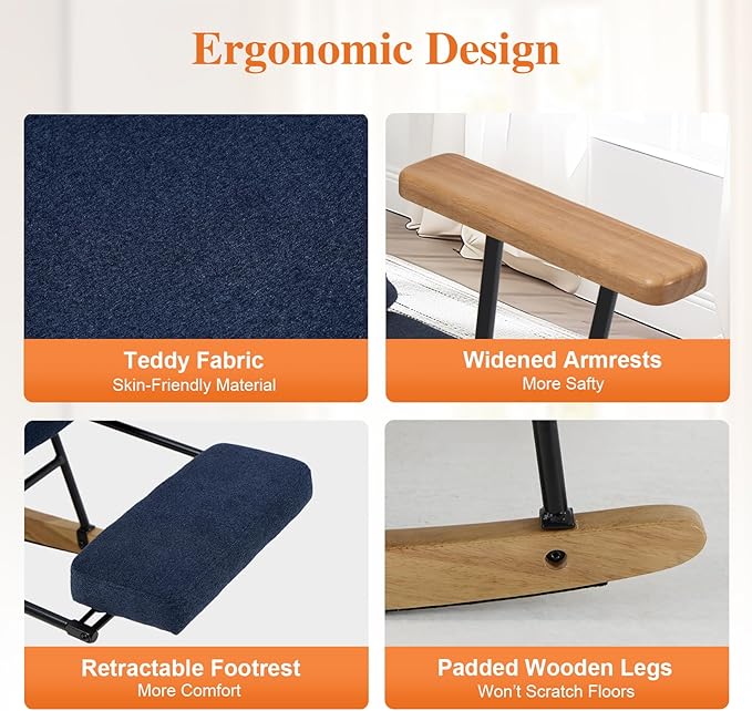 - STURDY SOLID WOOD LEGS & STEEL FRAME: Built to last, this rocking chair features solid wood legs and a reinforced steel frame, supporting up to 250 lbs. The elegant design ensures stability while enhancing the decor of your living room, bedroom, or nursery.