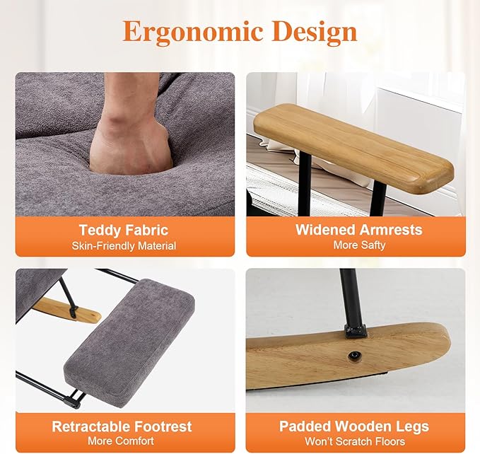 • PLUSH TEDDY FABRIC & DENSE PADDING: Upholstered in soft, skin-friendly teddy fabric, this glider chair offers an ultra-comfortable seating experience. The dense sponge padding provides both resilience and comfort, ideal for long hours of use.