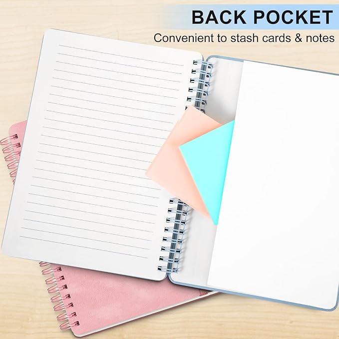 - Sturdy Spiral Twin-wire Binding & Inner Pocker: Feature a sturdy double spiral coil binding, the journaling notebooks are easy to flip the pages, flat and fold. Perforated inside pages allow to tear off unwanted pages. The back cover of the notebook journal includes an expandable pocket to store small objects. The elastic band on the outside of the lined notebook can also help you fix and mark pages perfectly. Perfect spiral bound journal notebooks for work, college supplies.