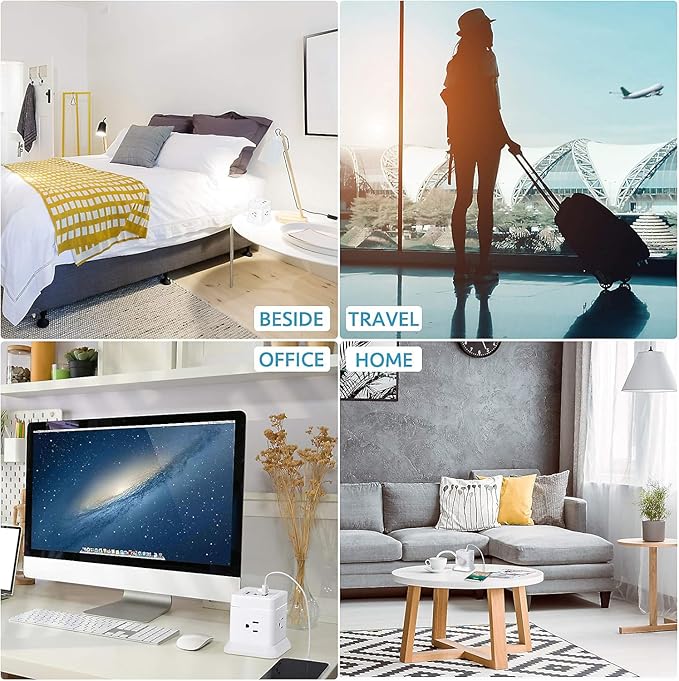 - 【7-IN-1 Cube Power Strip】The USB tower is equipped with 4 AC outlets and 3 USB charging ports in different directions to make full use of USB outlet. Provide power for up to 7 devices at the same time and all side outlet is designed for large adapters to charge without blocking each other, save your space and keep your desktop organized. You can charge your phone, lamp, laptop and other devices together.