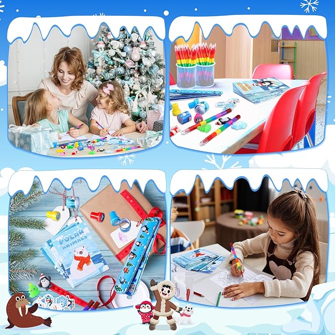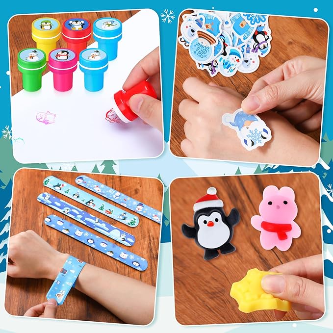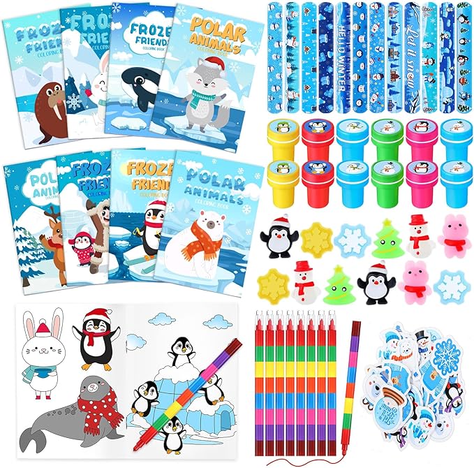 - Polar Animals Theme Gifts: our winter classroom gifts set includes 12 winter coloring books, 12 stress balls, 12 snowflake slap bracelets, 12 colorful crayons, 12 cute stampers and 50 stickers. Students alike will love them for their parties