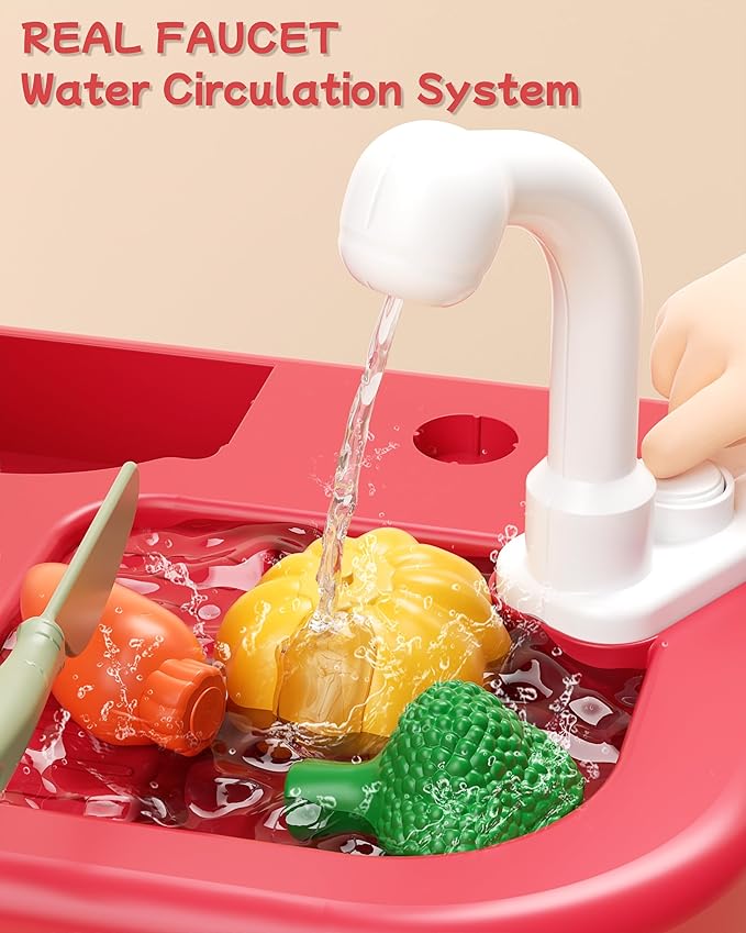 - 【Interactive Learning】Teach kids about water conservation and sustainability with the sink's water circulation system. Let them clean their play foods, plates, and utensils while having fun and enhancing environmental awareness.