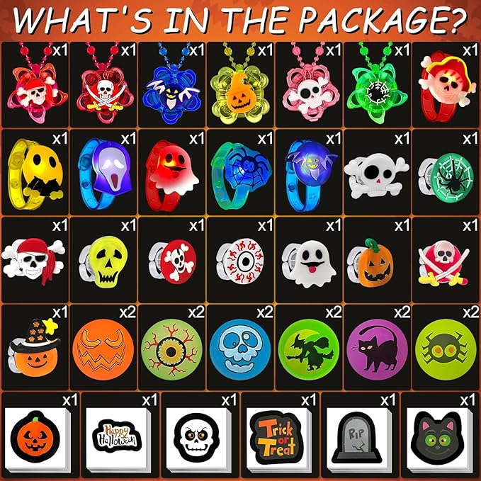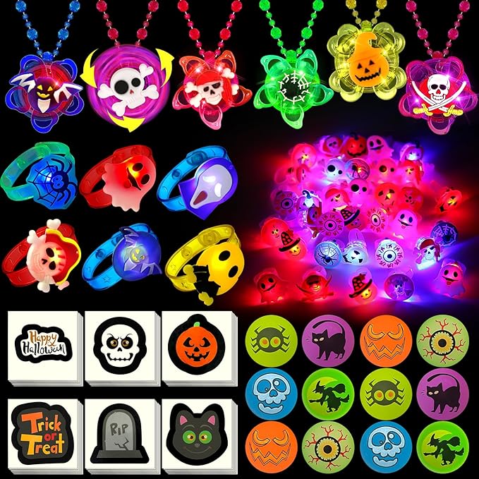 - [ Halloween elements ] Like Pumpkin, Spider, Bat, Ghost, Skull with the bright vibrant colors. The Necklaces Bracelets can be rotating, and led ring can flash for blue or red light, and temporary tattoos will glow in the dark. These light up flash Halloween toys will very popular party favors or kids hot bulk toys or so attractive to kids for Halloween treat bags or Halloween party supplies