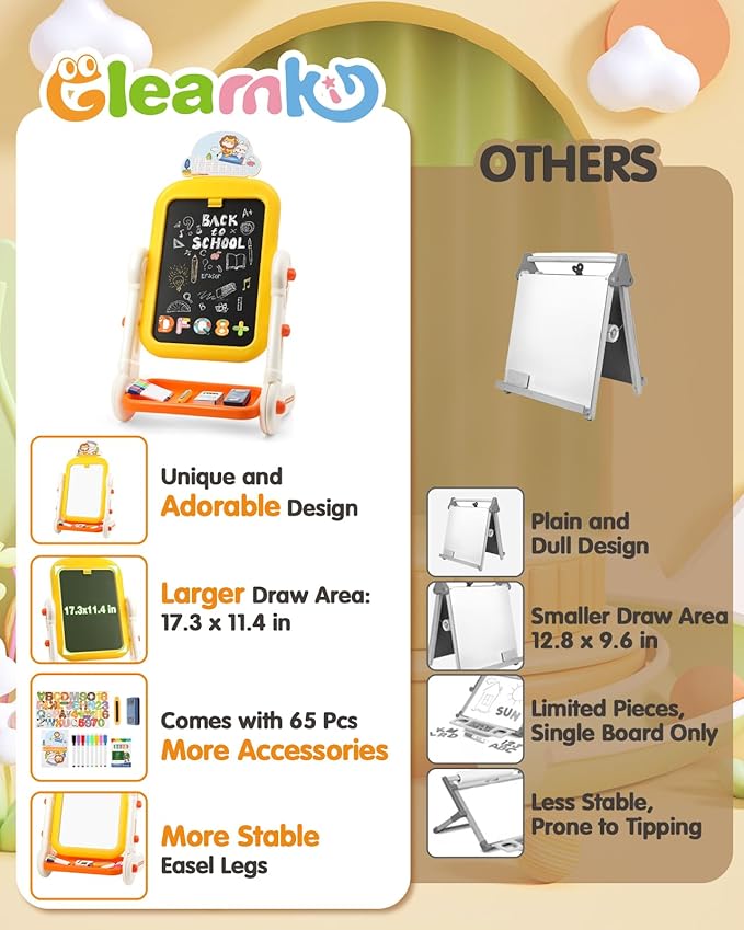 • Fun Accessories Included: Gleamkid toddler art easel comes with a storage tray, board eraser, 8 markers, 12 dust-free chalks with a magnetic holder, 41 magnetic stickers (letters, numbers, symbols), and a multiplication table sticker, transforming learning into an enjoyable and playful experience