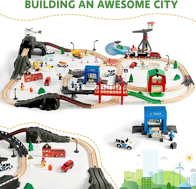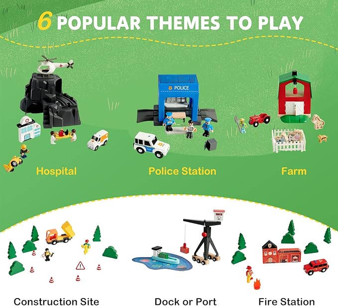 - 153PCS Wooden Train Set for Endless Fun: Joylike wooden train set includes 153 pieces featuring premium wooden tracks, themed building blocks, and various accessories. With six exciting themes-Hospital, Fire Station, Police Station, Farm, Construction Site, and Dock-kids can enjoy endless creative building and role-playing possibilities. Perfect for family time or group play!