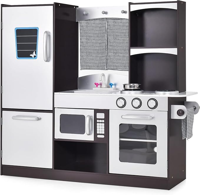 - Realistic Kitchen Experience: Our 42.5LBS Children's Kitchen Toy Set offers a realistic play kitchen experience for children over 3 years old. With a wooden design and a variety of features including a microwave, stove, sink, faucet, storage cabinet & shelf, and even curtains, this toy set provides endless hours of imaginative play.