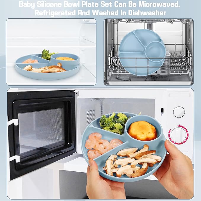 • Manage Baby Dish Set: The plate have suction points at their bases to help them stay secure on top of high chair trays, tables, and countertops. Effectively preventing your baby from throwing or tipping over the plate & bowl and making a mess