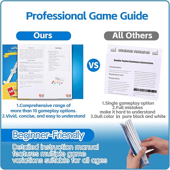 - Beginner-Friendly:Our Mexican train dominoes set includes Well-designed game manual to accommodate players of all ages and skill levels. With a variety of gameplay options clearly outlined, newcomers will find it easy to dive in, while experienced players can explore advanced strategies.Whether you’re playing dominoes with young kids or seasoned adults, everyone can discover a game style that resonates with them