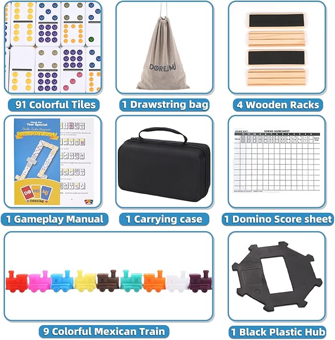 - 8 in 1 Mexican Dominoes Set: This dominoes Set is designed with 91 dot domino tiles, 4 wooden trays, 1 EVA case,1 drawstring bag, 9 trains, 1 game manual, 1 scorebook and 1 hub. The domino tiles are finely polished up to 5 times for shiny surfaces. The large storage bag, with thickened prime fabric and excellent durability, enables easier storage and carrying. To ensure that people of all groups and ages can enjoy this game freely, our team spend more than 4 weeks to finish an exhaustive and understandable instruction manual, with its diverse fresh rules, you will definitely love it.