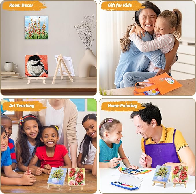 - Package includes: you will receive a mini watercolor paint set including 12 picture frames with easels, 12 long strip boxes of palette, 12 painting aprons and 12 canvas tote bags, 48 pieces in total; the sufficient quantity can meet your painting and learning needs