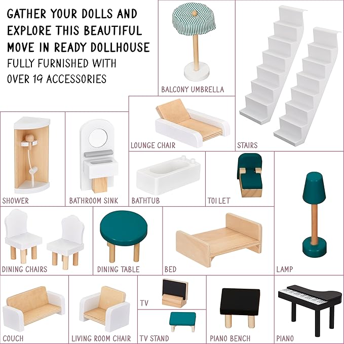 • DOLLHOUSE FURNITURE SET INCLUDED | Highly Realistic, Meticulously Decorated & Fully Immersive, Our Imaginative Play Set Has Little Ones Playing Straight Out the Box with 17 Lifelike Accessories: Living Room Sofa, Lamp, Kitchen Table, Chairs, Bathtub, Toilet, Piano, Bench, Patio Umbrella, Bed & Bedroom Nightstand | Rooms are Also Covered in Colorful, Detailed Wallpaper for Gorgeous Aesthetic