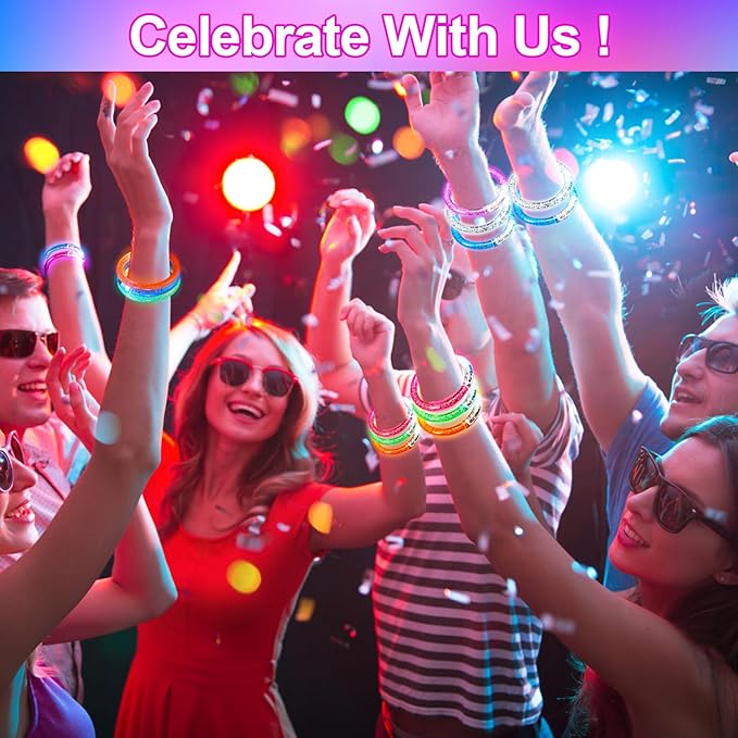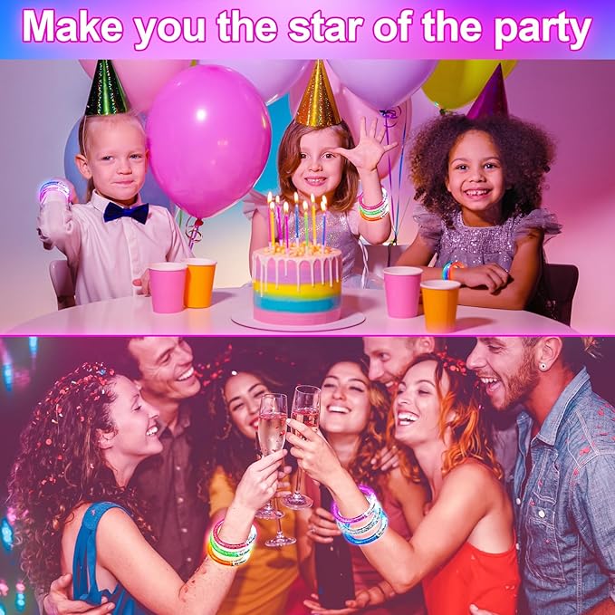 - Glow in the Dark Party Supplies: Our light up bracelets are great for glow in the dark party, birthday party, neon rave concert, dance, bar, etc. Flashing colorful and beautiful, enjoy the great visual.