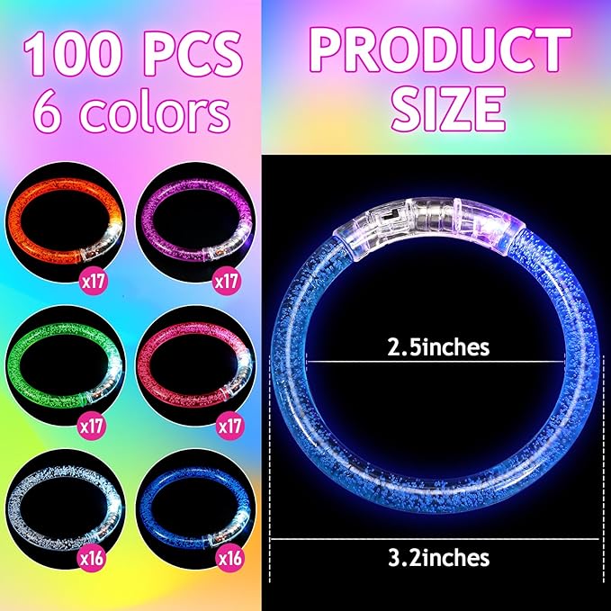 - Package Includes: You will receive 100 pieces of LED bracelets in 6 different colors, including pink, green, blue, purple, crystal and orange. They can help you prepare a wonderful party for your friends and family.