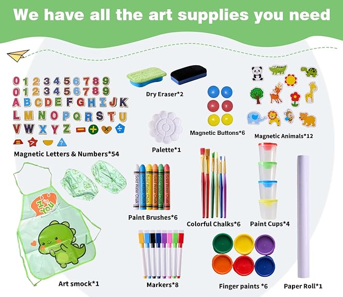 - 【Luxurious art accessories】You will get 2 paper rolls, 6 finger paints, 4 markers, 4 paint pots, 6 round magnetic buttons, 1 set of magnetic letters and numbers, 1 dry eraser, 5 paint brushes, 1 palette board, 1 art smock and 12 colored chalks. Art has no age limit. Embark on an artistic journey with your children.
