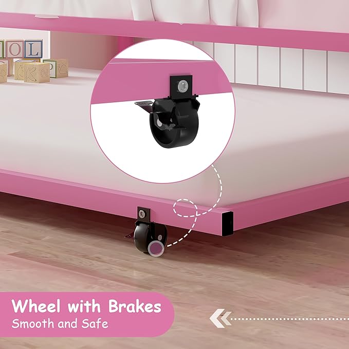 VECELO Twin Over Twin Bunk Bed with Trundle, Convertible Metal Bunkbeds with 2 Ladders and Guardrails, Space Saving, No Box Spring, Pink