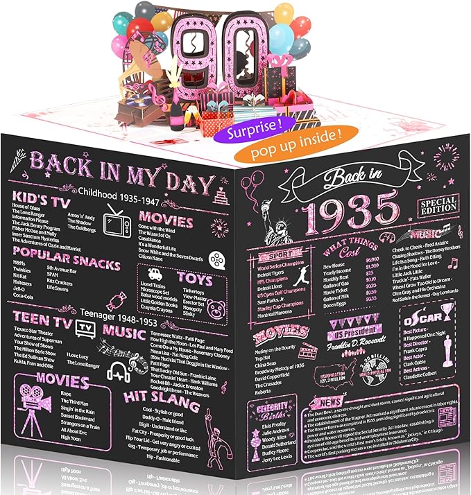 90th Birthday Card for Women, Jumbo 3D Pop Up 90th Birthday Gifts for Mom Grandma, Back In 1935 Happy 90 Year Old Sister Birthday Decorations Cards Card for Her, Rose Gold