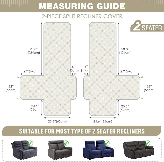 - 【2 SEATER RECLINING FIT】Our 2 seater recliner loveseat cover is designed to fit 2 seater love seat sofas, made with 2 seperate pieces , perfectly fit 51.2 inch reclining 2 seater sofas. For more details, please refer to the measurement guide in the photo, please measure before purchase