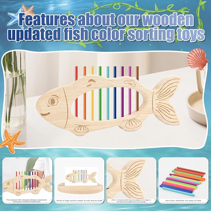 - Safe and Durable Material: Our specially designed and manufactured wooden fish-shaped color sorting toys are made of natural premium wood, which is sturdy and durable, and the material is safe, non-toxic and odorless. You can safely choose this fish color sorting matching toy as your child's Montessori early education color cognition enlightenment toys