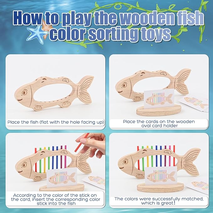 - Good Workmanship and Fun Fish Design: We chose the fish shape that attracts children's attention to design the color sorting toy. It is exquisitely made and comes with a wooden card placer. You can put the cards in the wooden tray to play