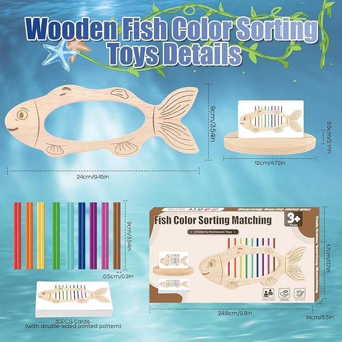 - Upgraded Fish Shape Color Sorting Toys: Our wooden fish color sorter matching toys set includes: 1pcs wooden fish(24cm/9.45in*9cm/3.54in), 18pcs multicolored wooden sticks, 30pcs cards(with double-sided printed), 1pcs wooden card tray(12cm/4.72in*5.5cm/2.17in)