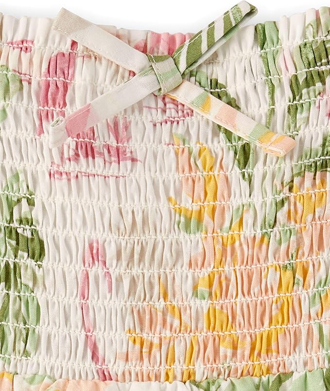 • FEATURES: Smocked bodice with non-functional bow, tiered body, tropical print