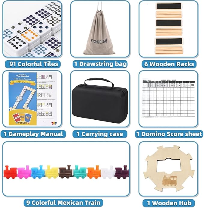 - Complete Mexican Dominoes Set:The double 12 dominoes Set includes all necessary components (91 dot domino tiles, 6 wooden trays/holders, 1 portable storage case,1 drawstring bag,9 vibrant small trains, 1 game manual, 1 scoreboard, and 1 Wooden hub).Catering to various gameplay styles and occasions. Whether indoors or outdoors, with small or large groups, this versatile Mexican Train domino set is perfect for travel and outings.